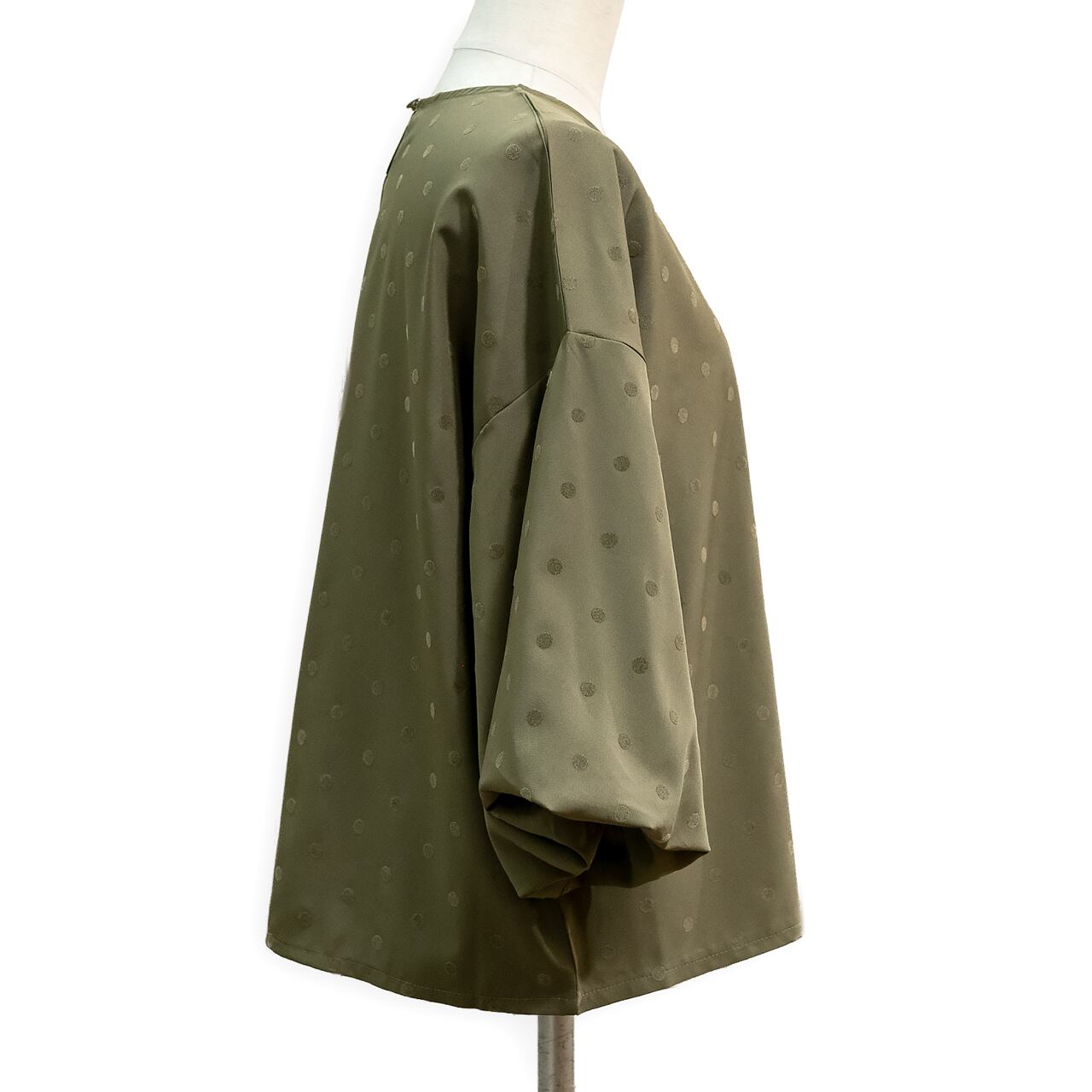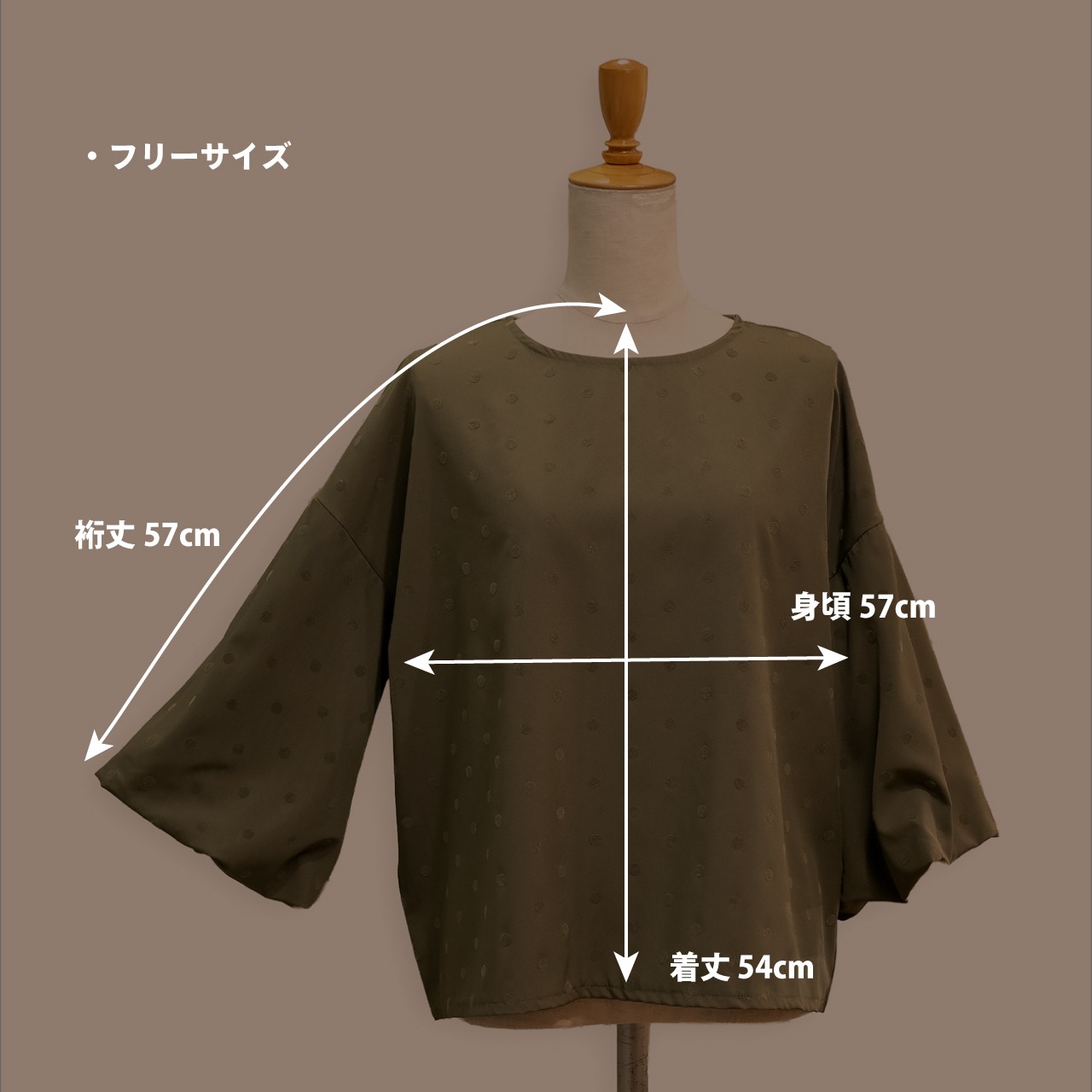 ボリューム感のある袖が華やかな七分袖ブラウス。凹凸の出るドット柄で表情豊かに。初秋から楽しmる七分丈。スカートやワイドパンツと合わせてカジュアルすぎない、ちょっと綺麗めなスタイリングが楽しめます。