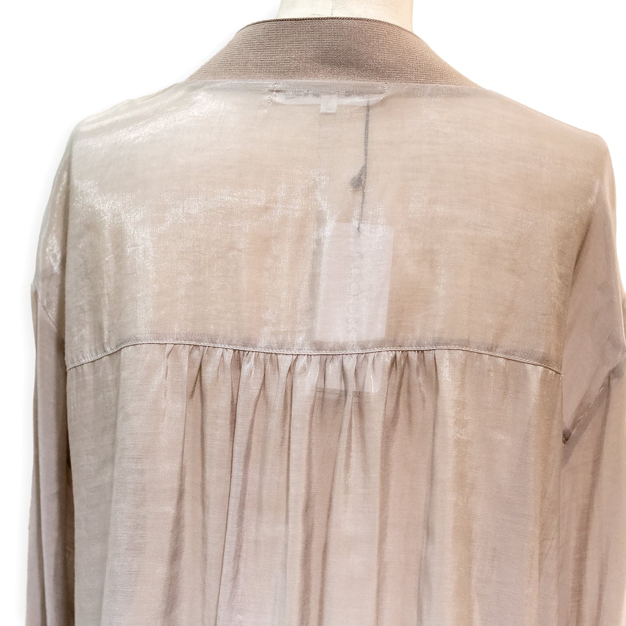 身頃と袖はシアーの布帛に、襟と前立てそして袖はリブニットに切り替えたたドッキングデザインのカーディガン。貝調のボタンを使用し、高見えするディテールです。袖をたくし上げこなれ感を出した着方がおすすめです。