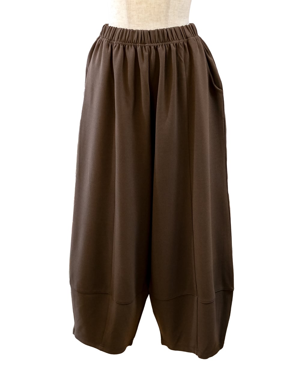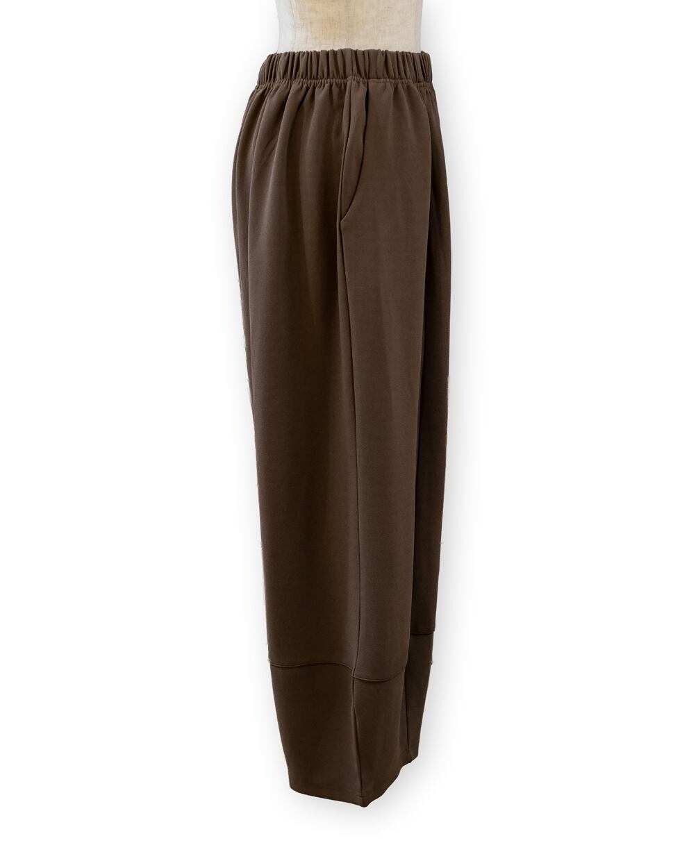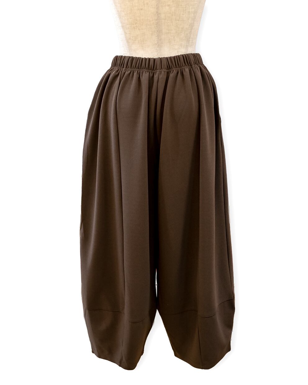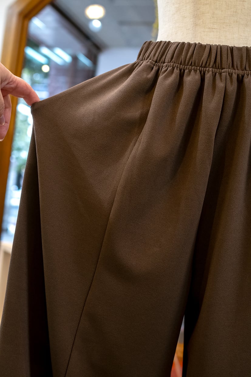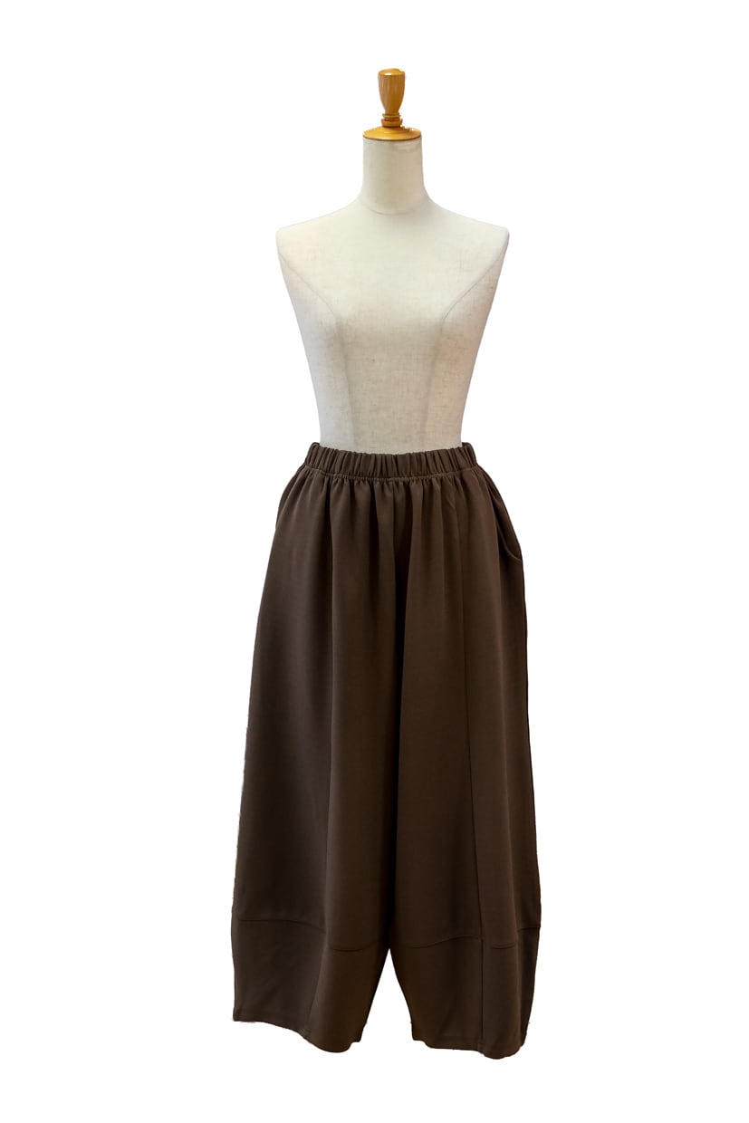 ・ほどよい厚地のある生地をたっぷり使い、裾に切り替えを入れた丸みのあるバレルパンツです