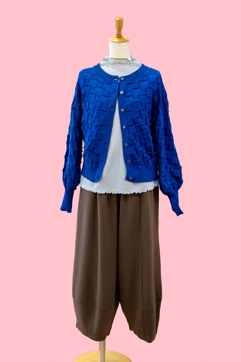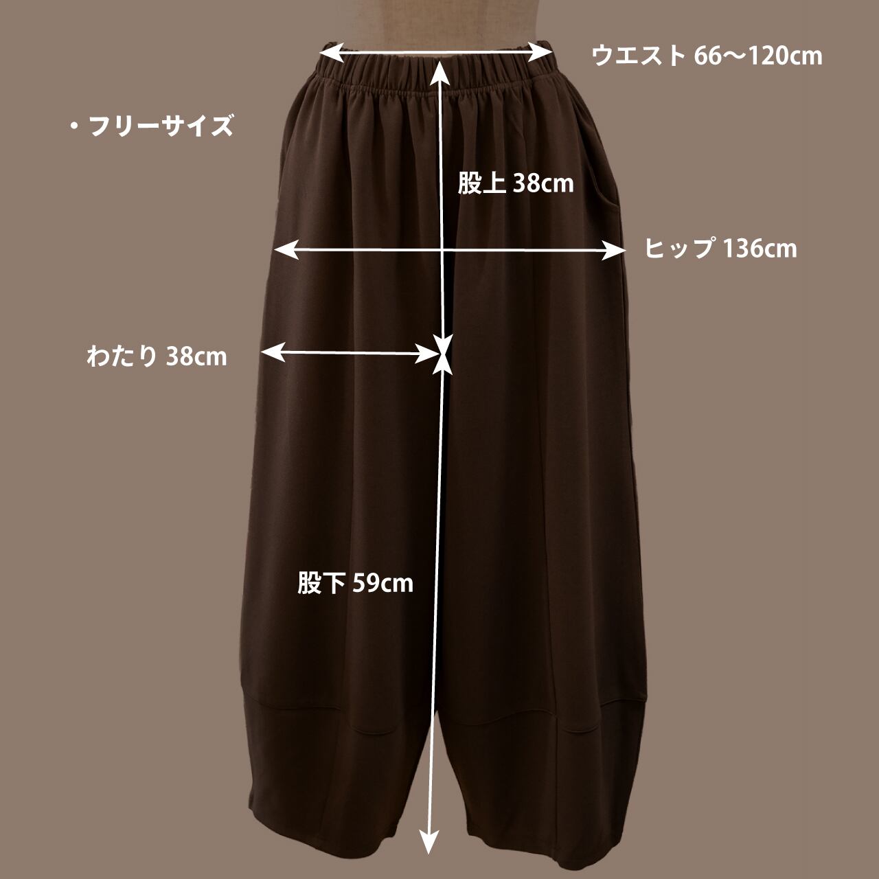 ・明るめなココア色で、白やベージュ、黒などベーシックなトップスとも相性が良く、ロングシーズン活躍します。また差し色にビビッドなカラーを持ってきても馴染みやすく合わせやすいパンツです