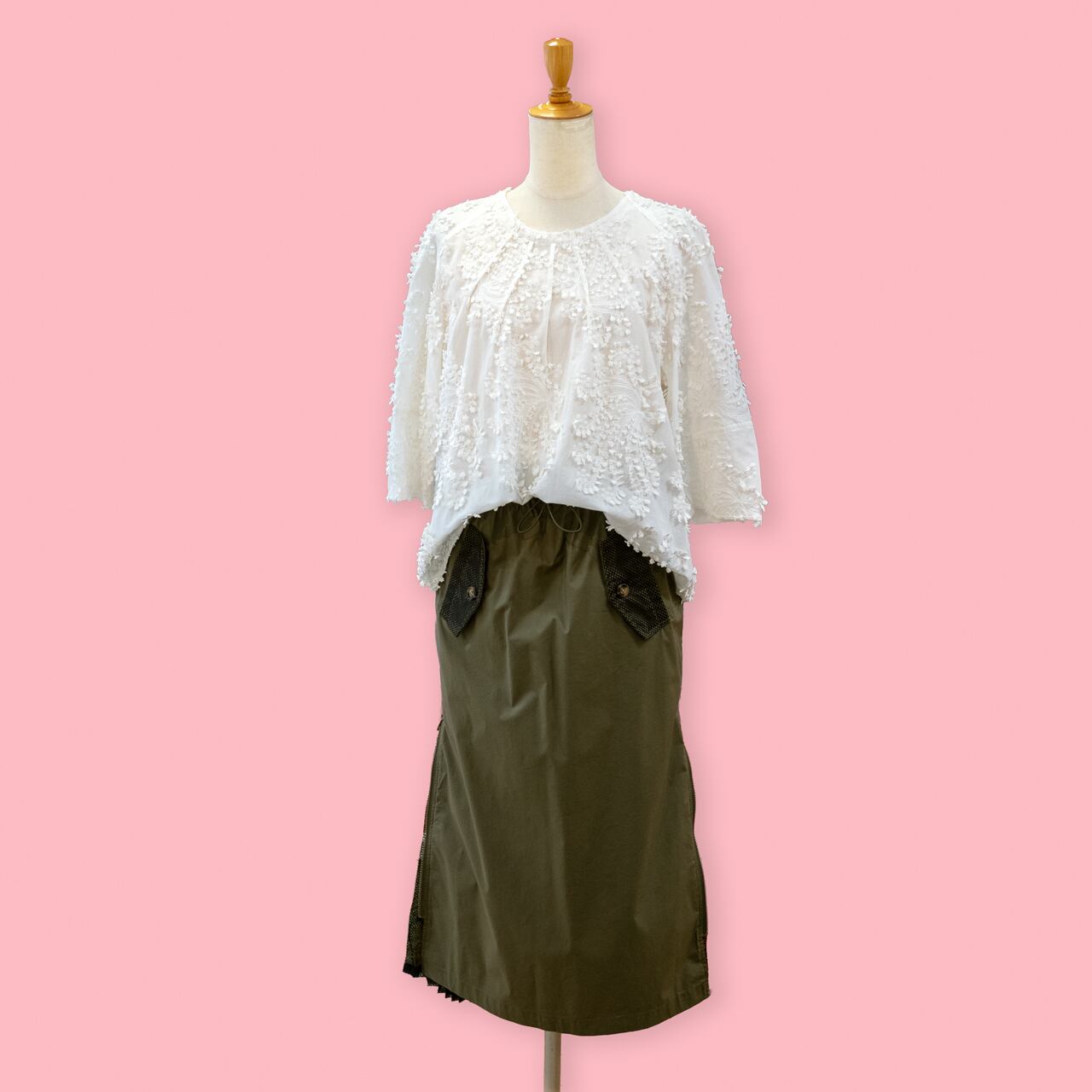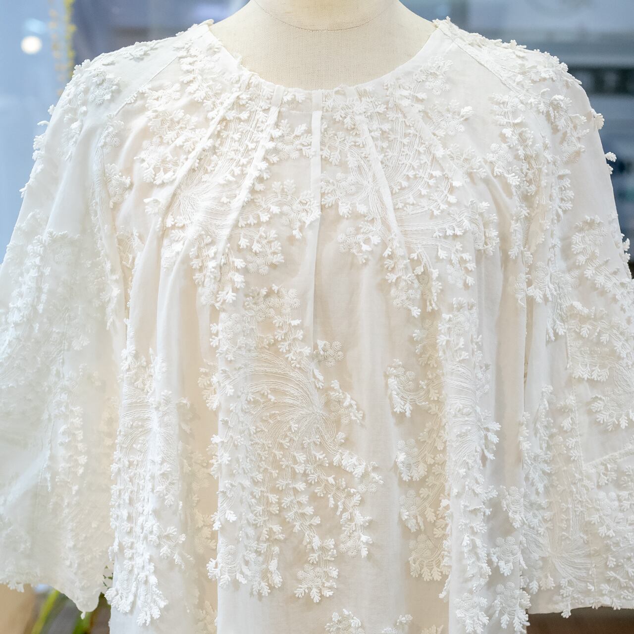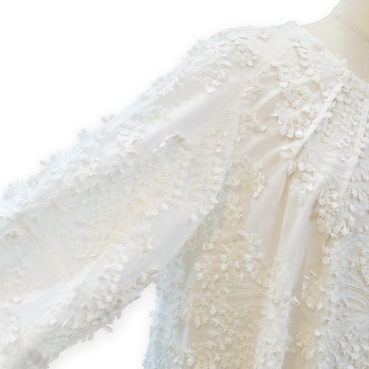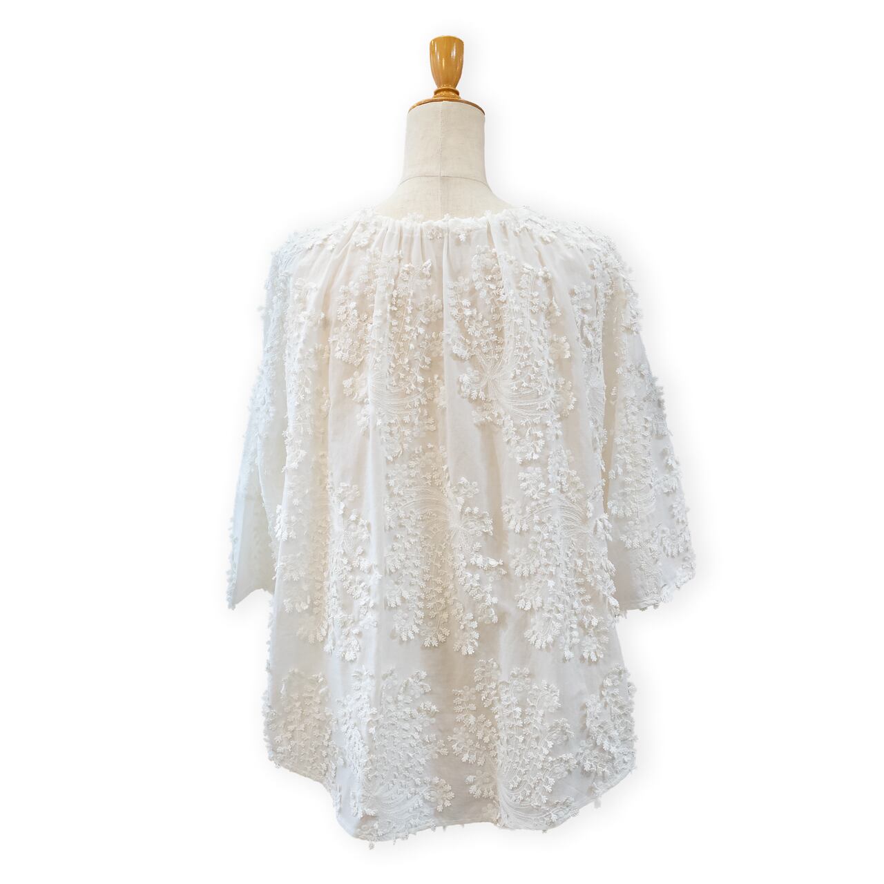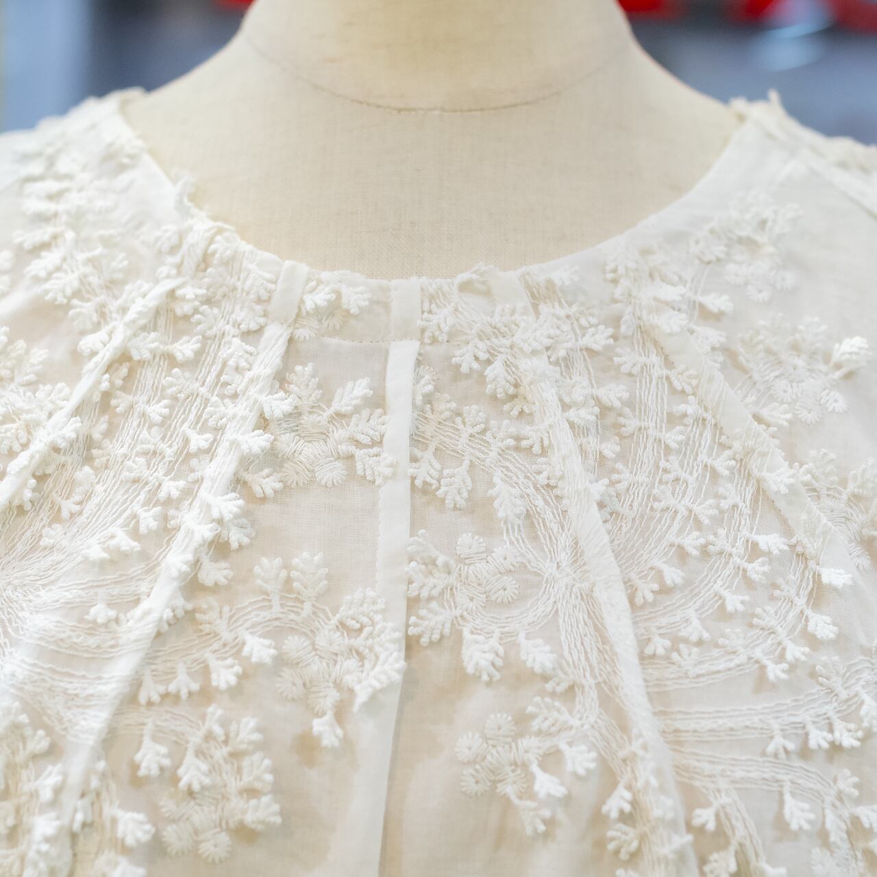 ふんわりとしたシルエットと立体刺繍が魅力の真っ白なブラウスです。