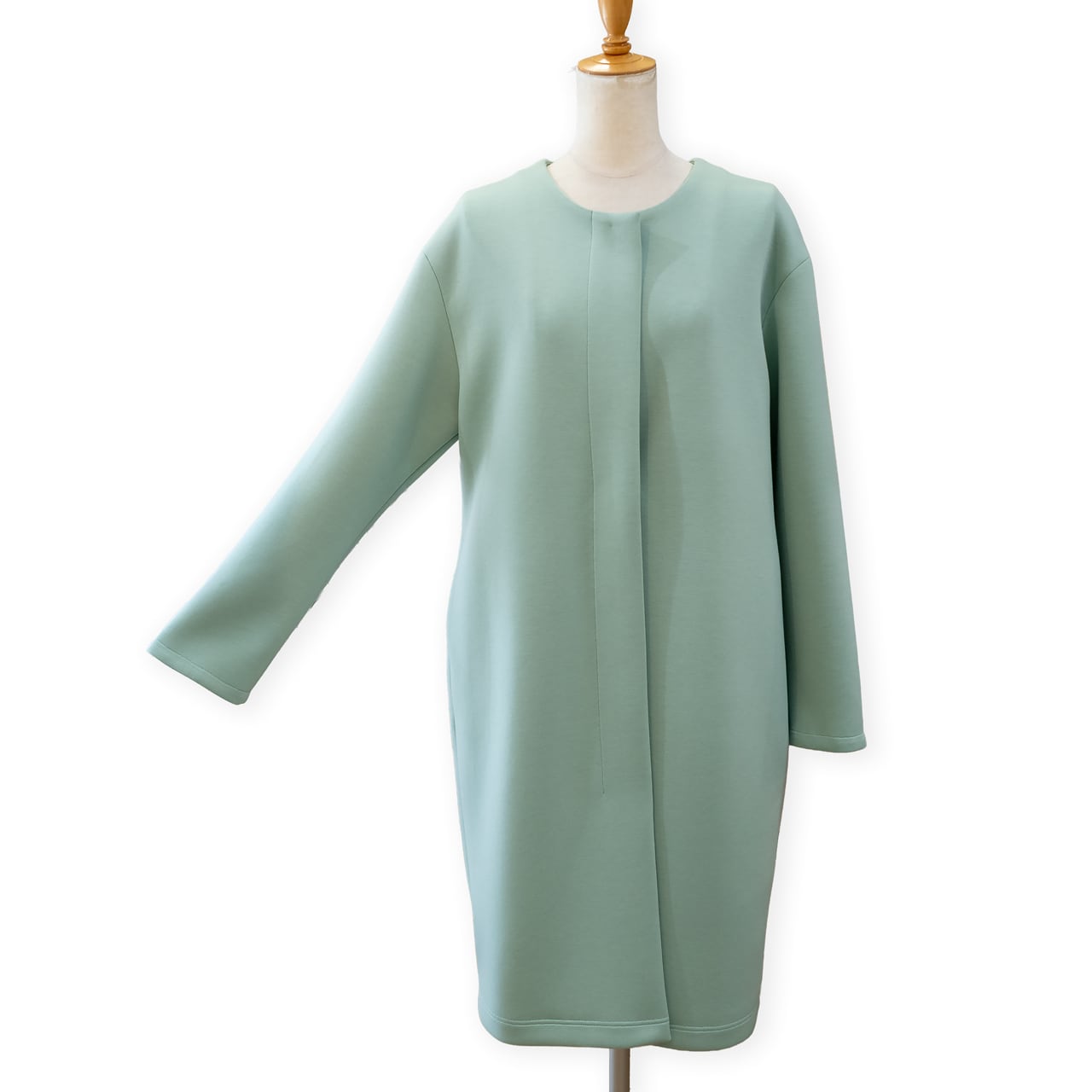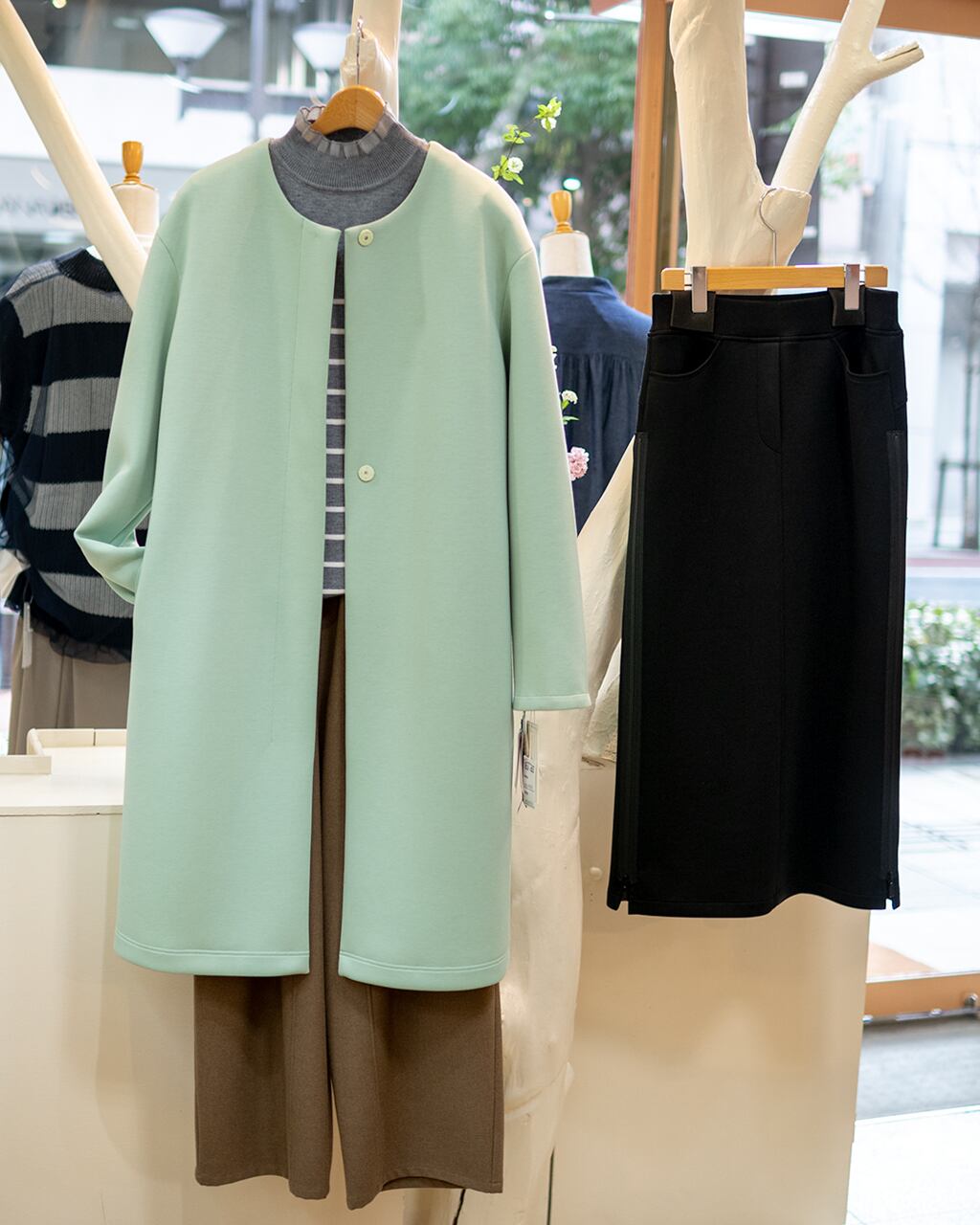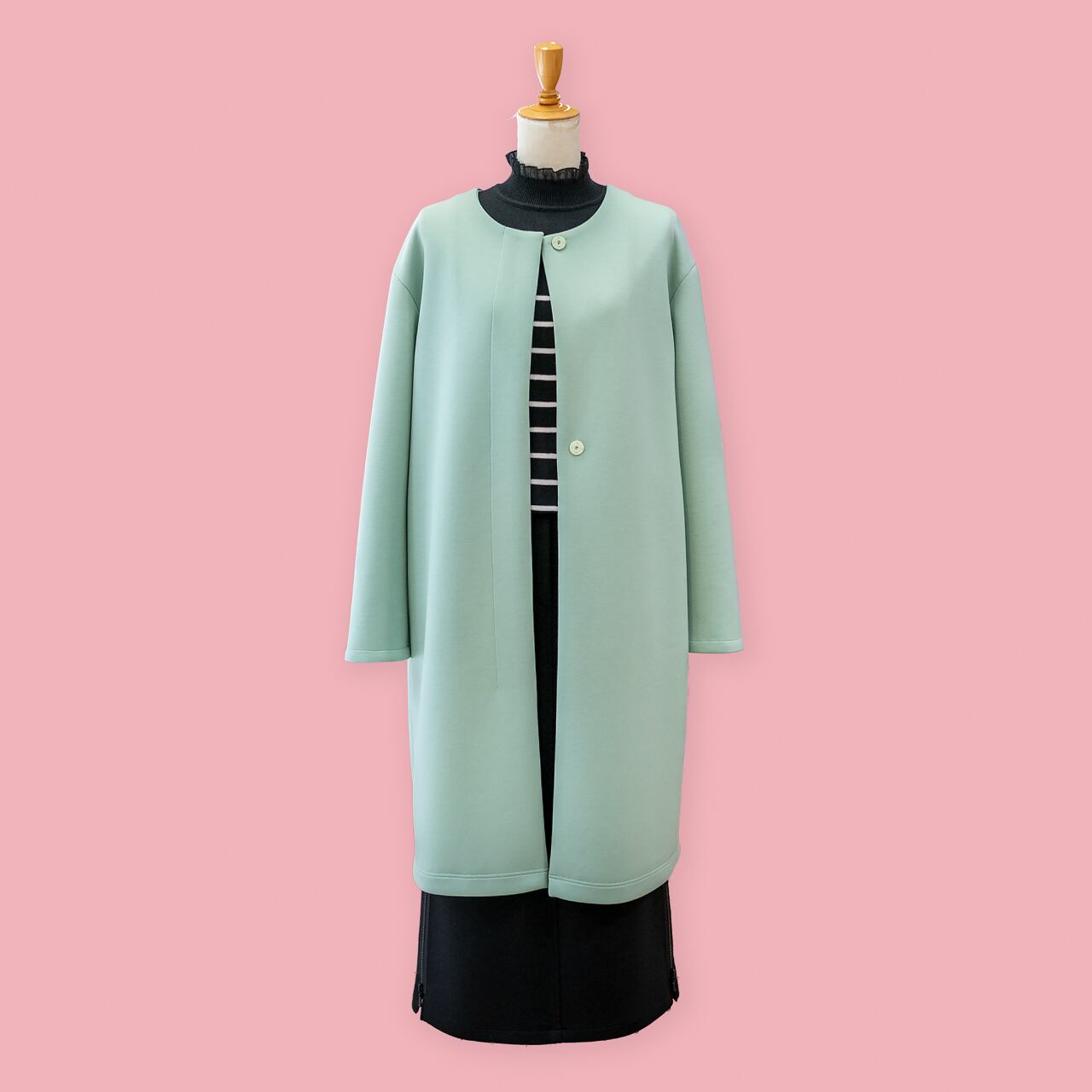 コートとカーディガンの中間的なアウター「コーディガン」タイプで、さっと羽織れる軽さときちんと感を両立しています。