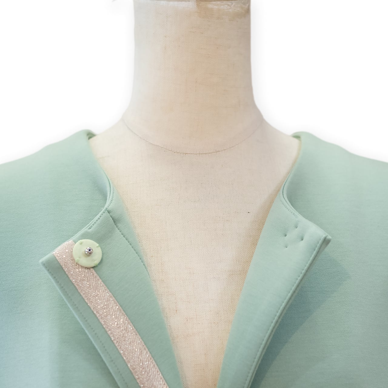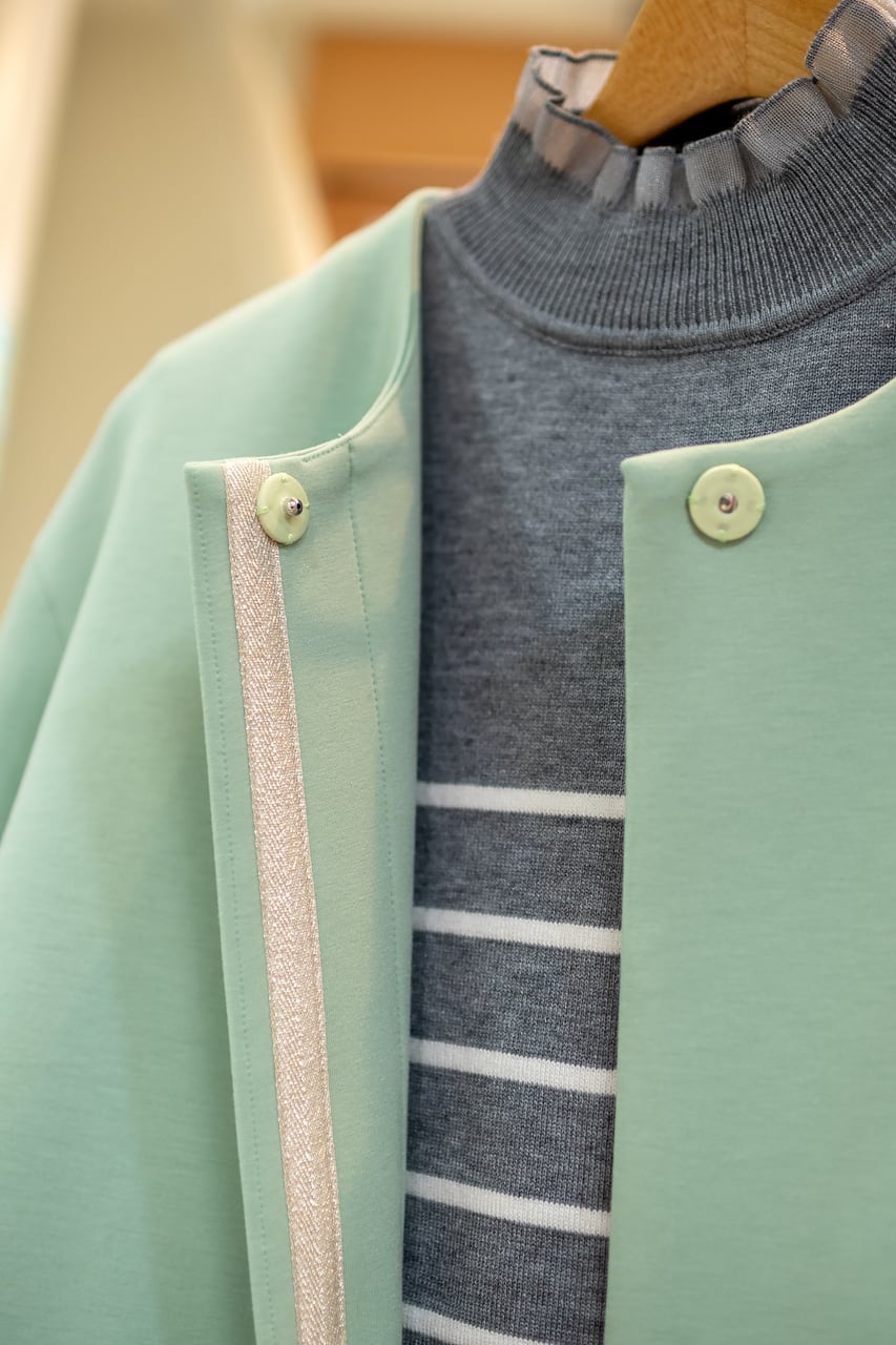 ノーカラーのシンプルデザインなので、タートルやシャツ、ストールとも好相性です。