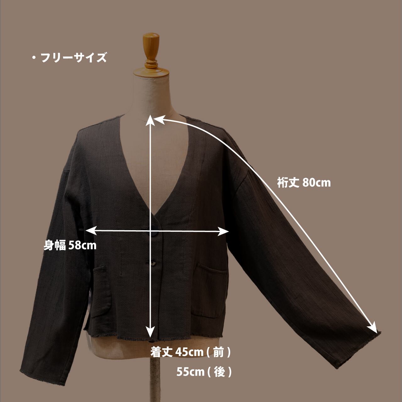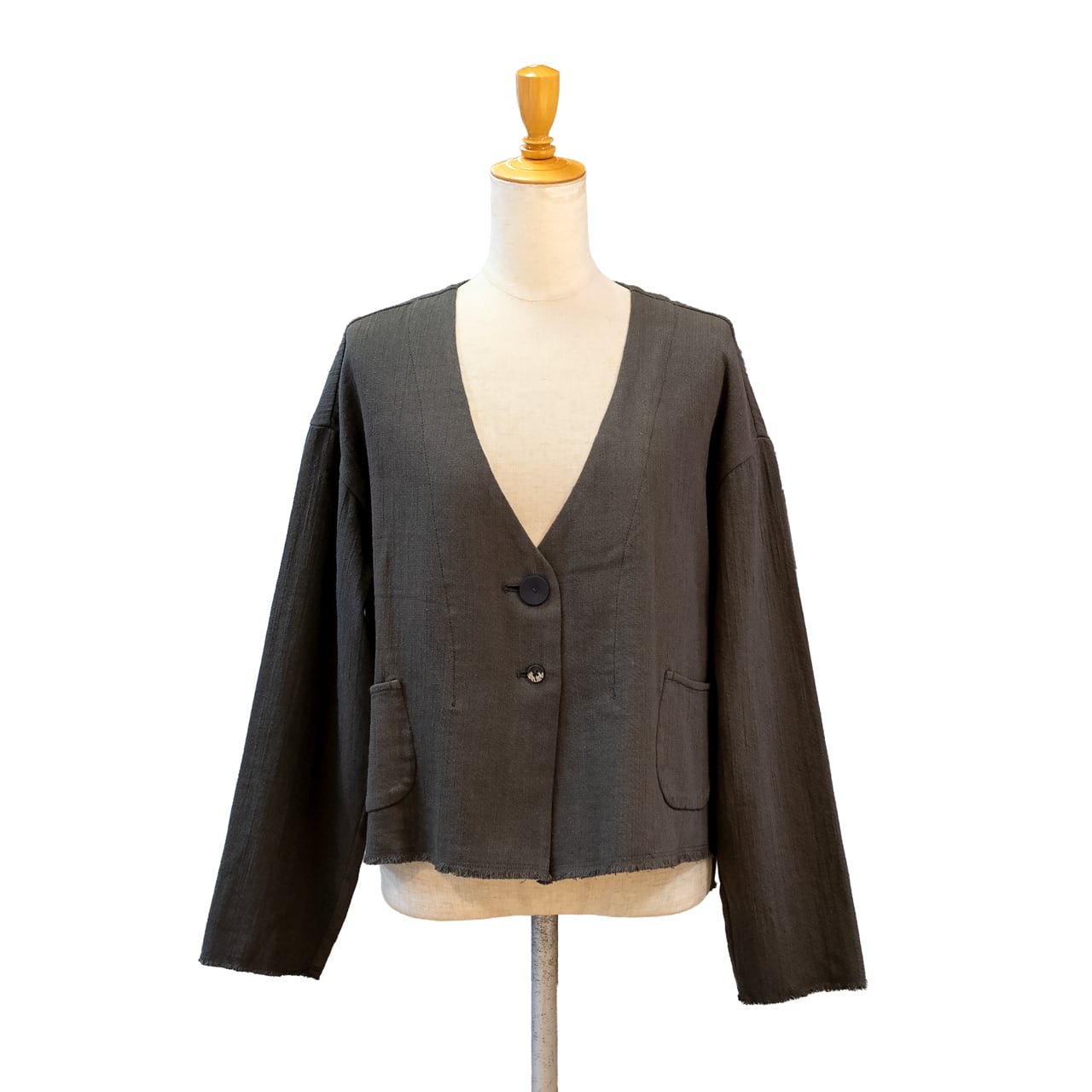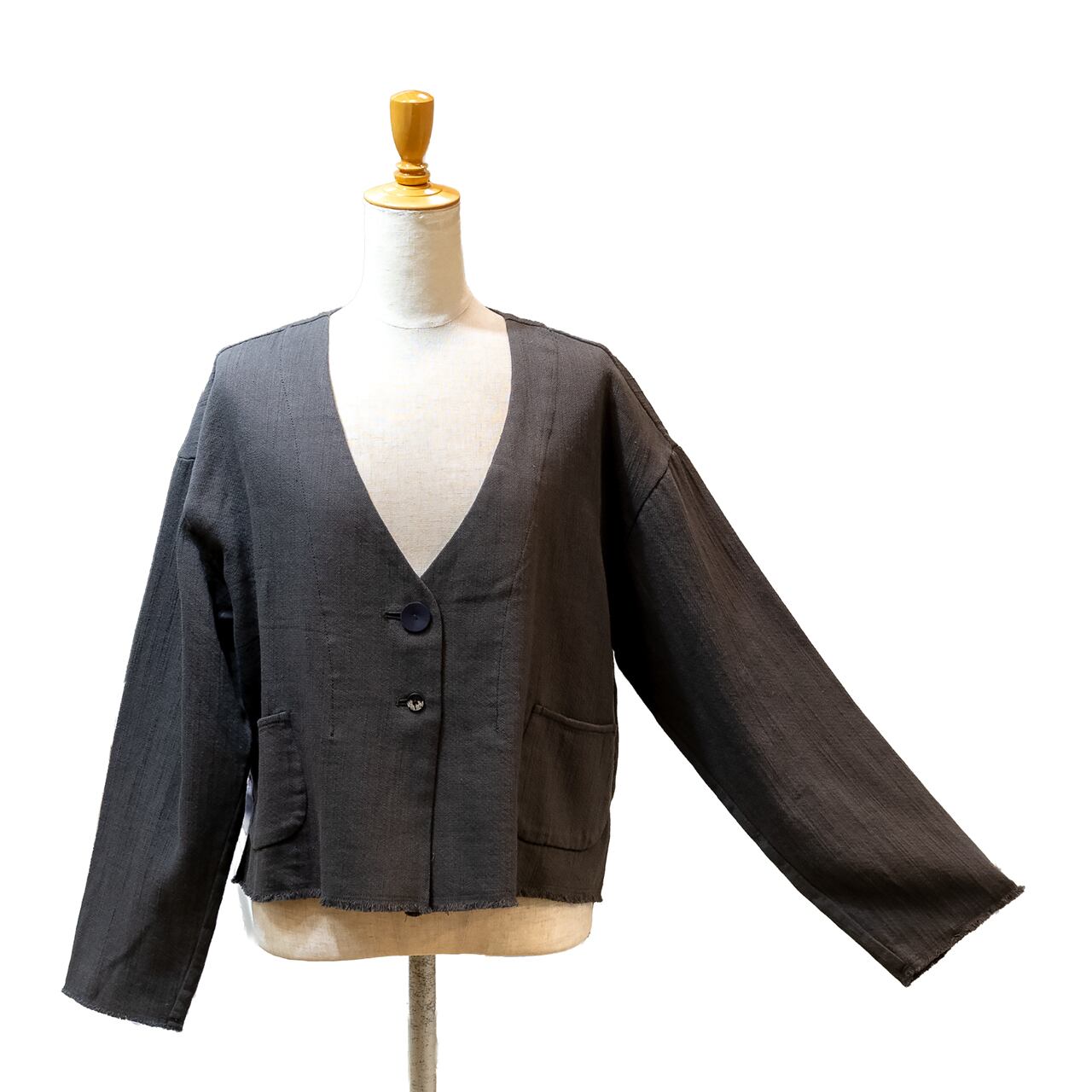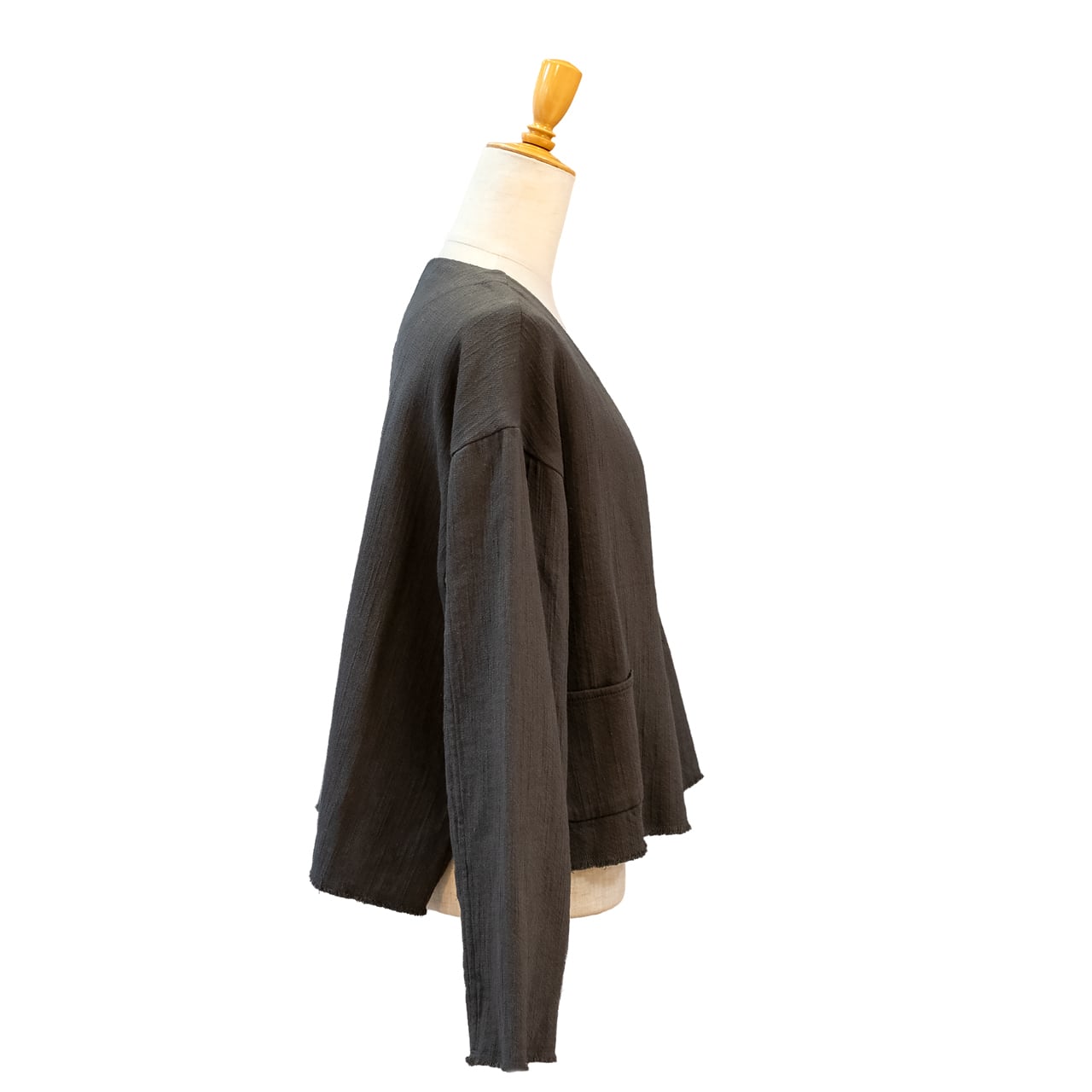 コットン太番手の乾いた質感と凹凸感が生きる、素朴で味わい深い素材を使用したクロップド丈の羽織アイテム。柔らかく優しい風合いで、インナーを選ばず軽やかに纏える、大人の頼れる一着です。
