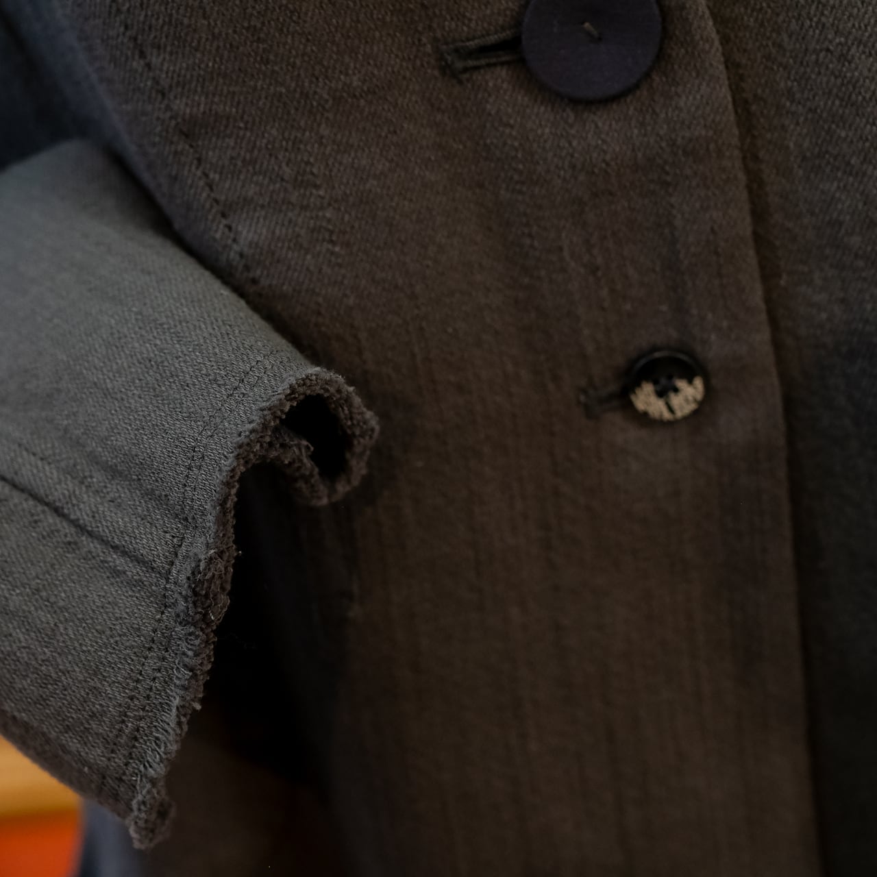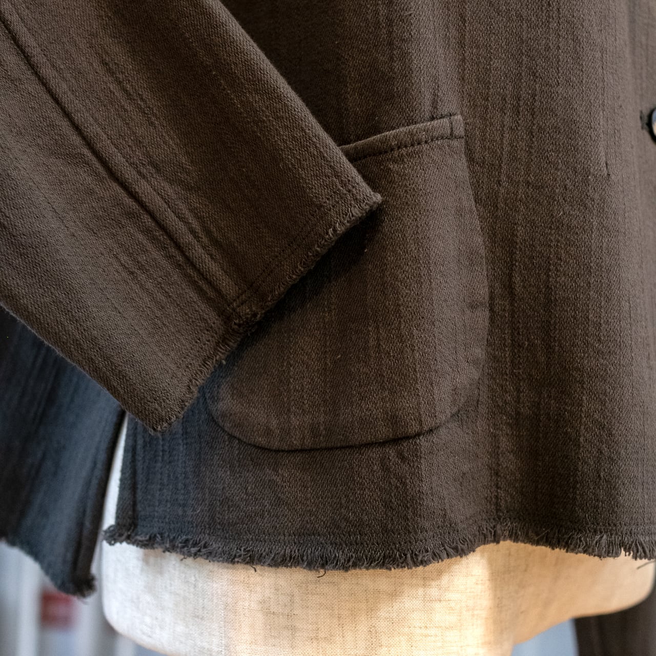 裾と袖口はあえてカットオフ(切りっぱなし)にしてラフさを強調し、内側の見返しには光沢感のあるサテンをあしらい、ちらりと覗くディテールも洗練。