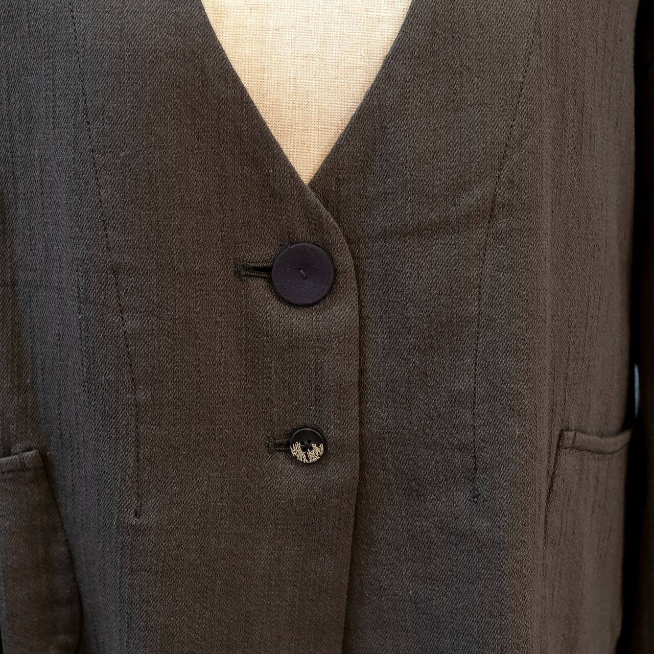 すっきりとしたV開きに大小のボタンが可愛らしいアクセントのショートジャケット。