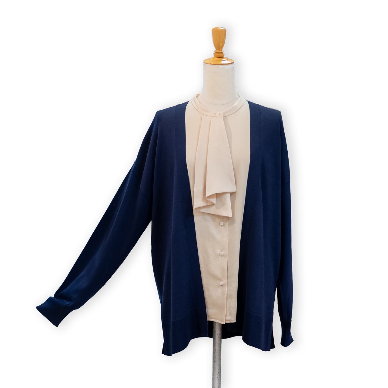 画像のように、ボウタイブラウスや明るいベージュのインナーと合わせれば、上品なきれいめコーデが完成します。デニムと合わせて大人カジュアルに、またワイドパンツやテーパードパンツと合わせてお仕事モードにと、着回し力は抜群です。