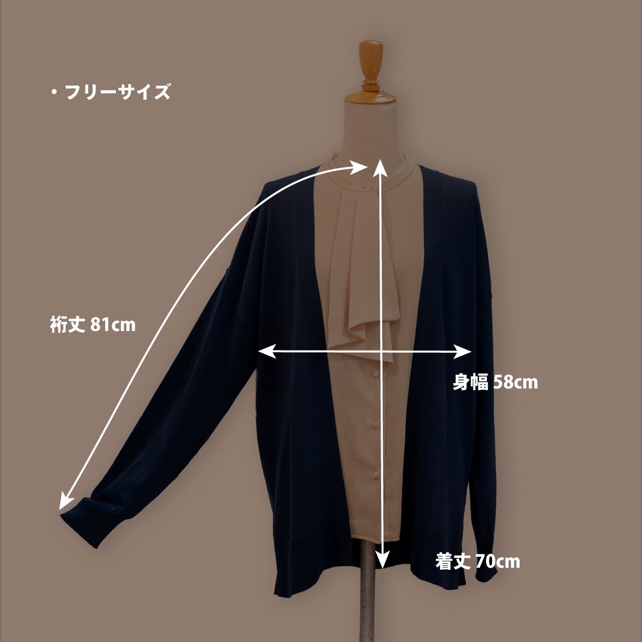 裄丈: 81cm (※ドロップショルダーのため、首の付け根から袖先までの計測値です)