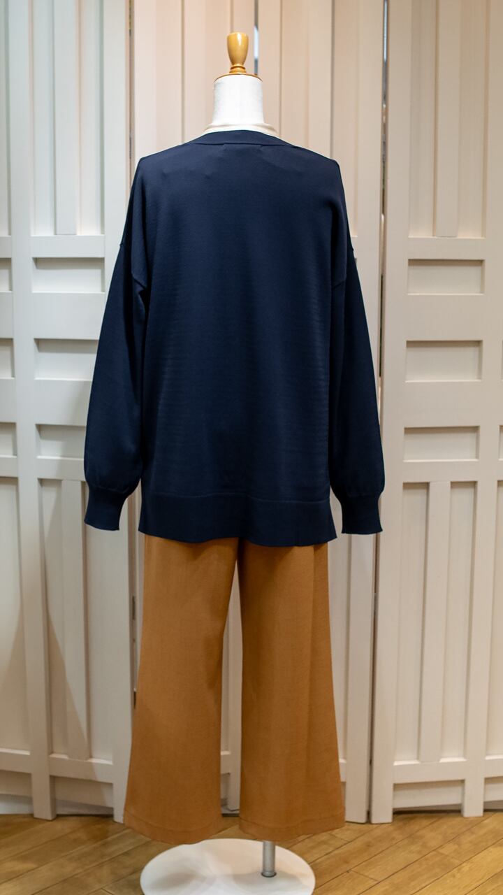 気になる腰回りをしっかりカバーする70cmの着丈。ゆったりとした身幅ながら、落ち感のある素材なので着膨れせず、スッキリとした縦ラインを強調します。